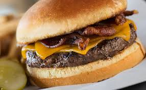 Top Sirloin Buger with Smoked Bacon, BBQ Sauce and Cheddar Cheese on a Toasted Bun.